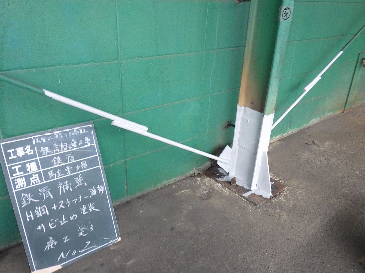 着工前→ ↑常時水に濡れてしまう環境であり、土間勾配が適正に施工されていないため水溜りが出来てしまい鉄骨が腐食してしまっている状況です。 このままではいつ倒壊してもおかしくないので補強をおこないます。 |