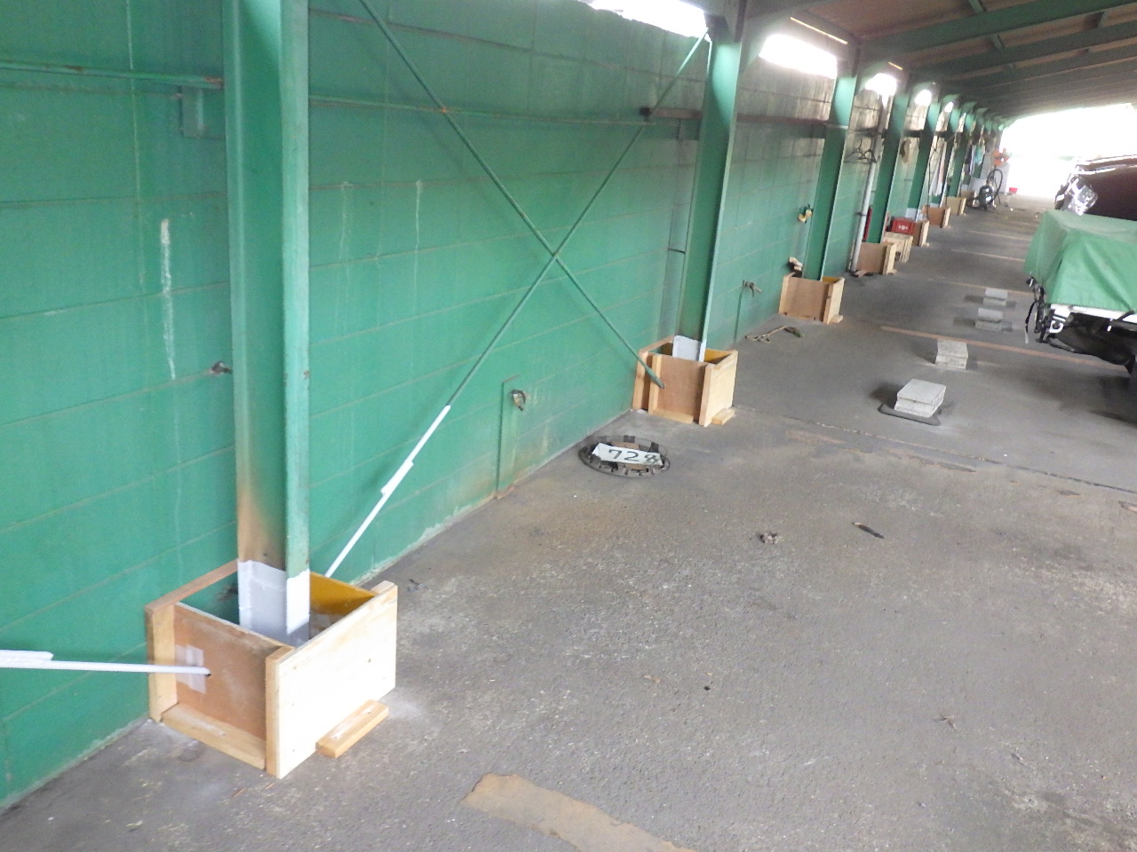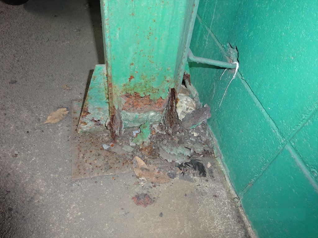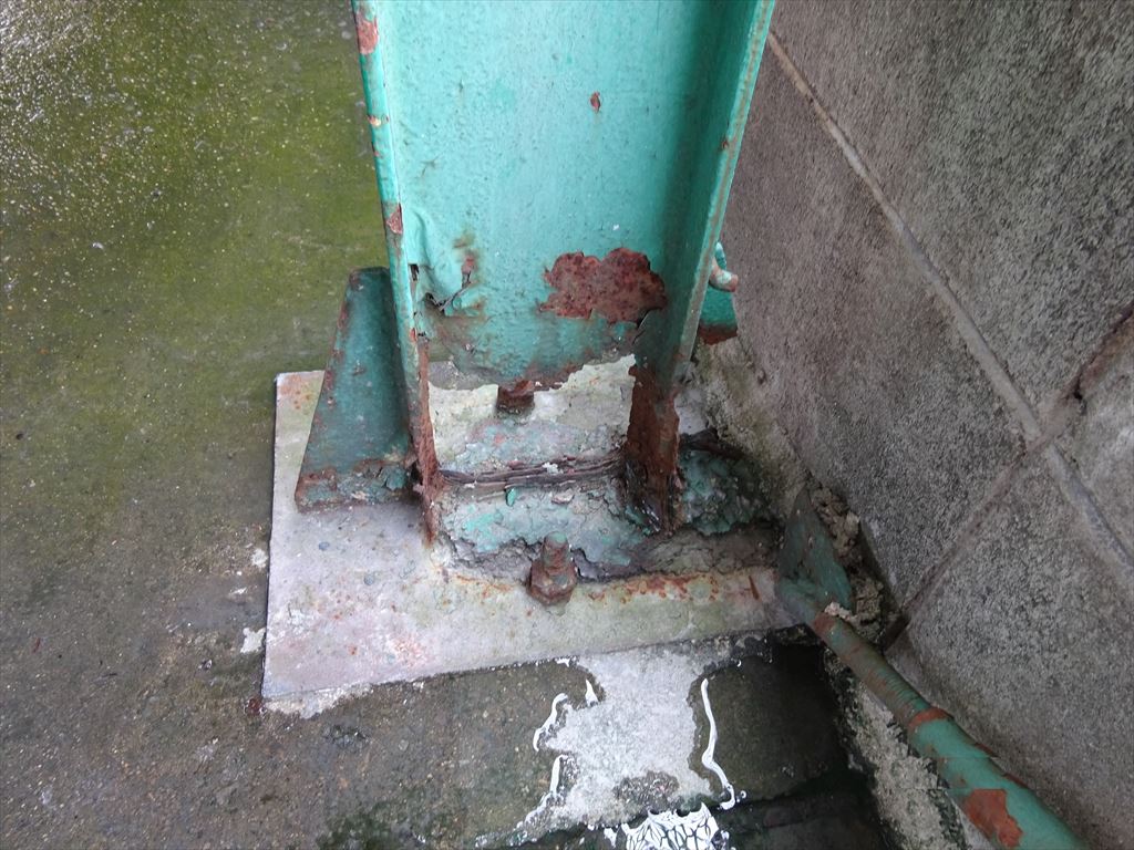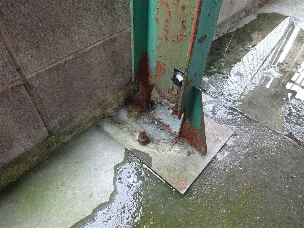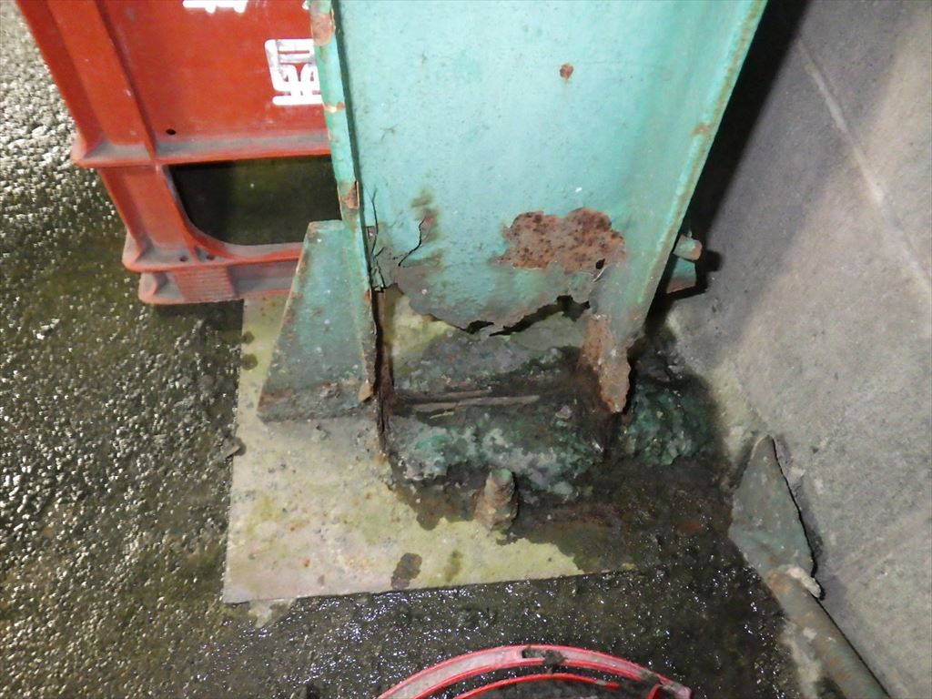 着工前→ ↑常時水に濡れてしまう環境であり、土間勾配が適正に施工されていないため水溜りが出来てしまい鉄骨が腐食してしまっている状況です。 このままではいつ倒壊してもおかしくないので補強をおこないます。 |