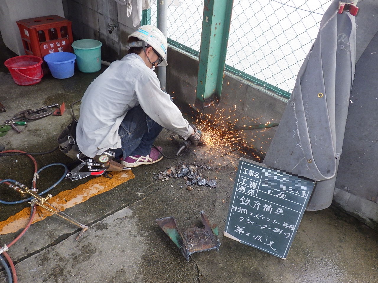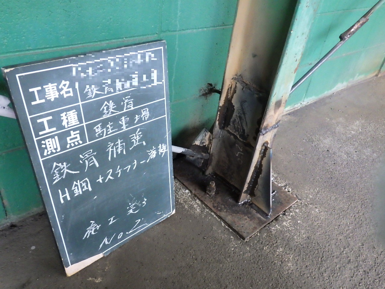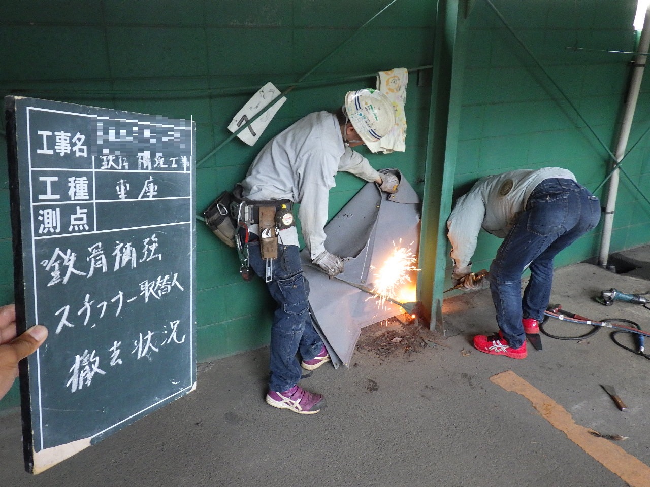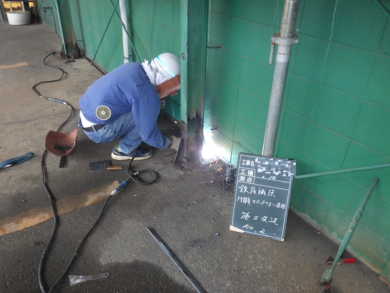 施工状況→ ↑腐食している部分の柱を切断のうえ撤去致します。 その際に鉄骨レベルが下がらないよう左右にパイプサポートで鉄骨を支えて下がらないように致します。 ↑切断面凸凹部分のベースPL側をグラインダー掛けをおこなうことで溶接面をしっかり確保します。 ↑切断したことで多少の柱位置がズレるので、専用治具を使い適正な位置へ戻します。 ↑補強する鋼材が適正なものが現場で再度検収します。 (※上記材料検収の工程が品質管理をするうえで非常に大事です。) ↑新設鋼材の溶接状況です。 ↑新設鋼材の溶接が完了です。 ↑溶接部分のサビ止め塗装をおこないます。 ↑水による腐食を繰り返さない為にコンクリートで根巻きをおこないます。 |