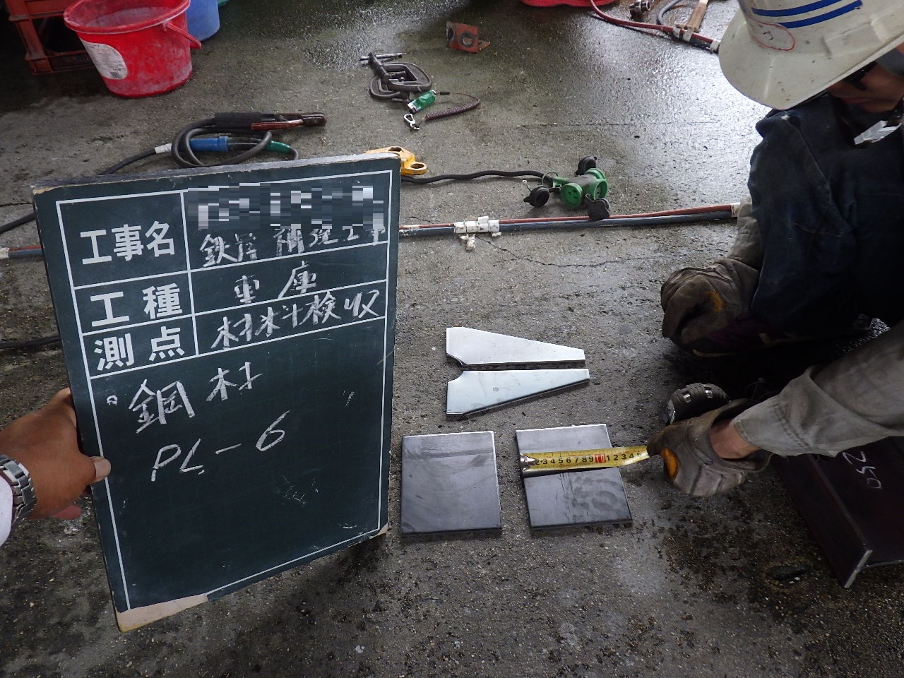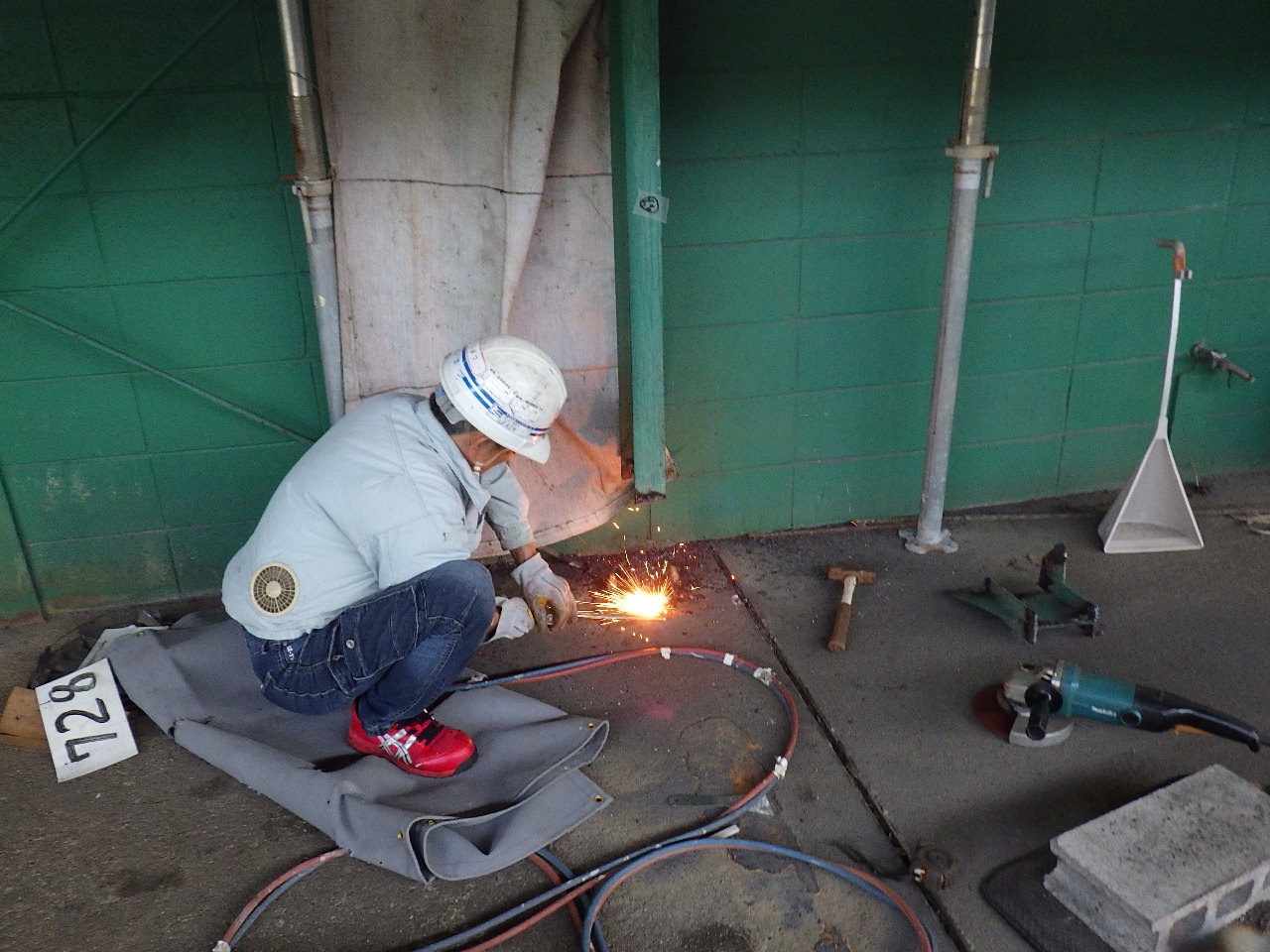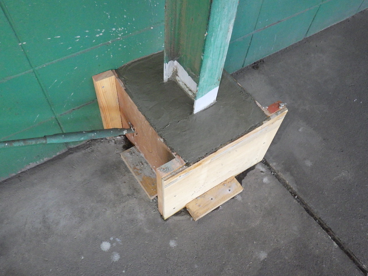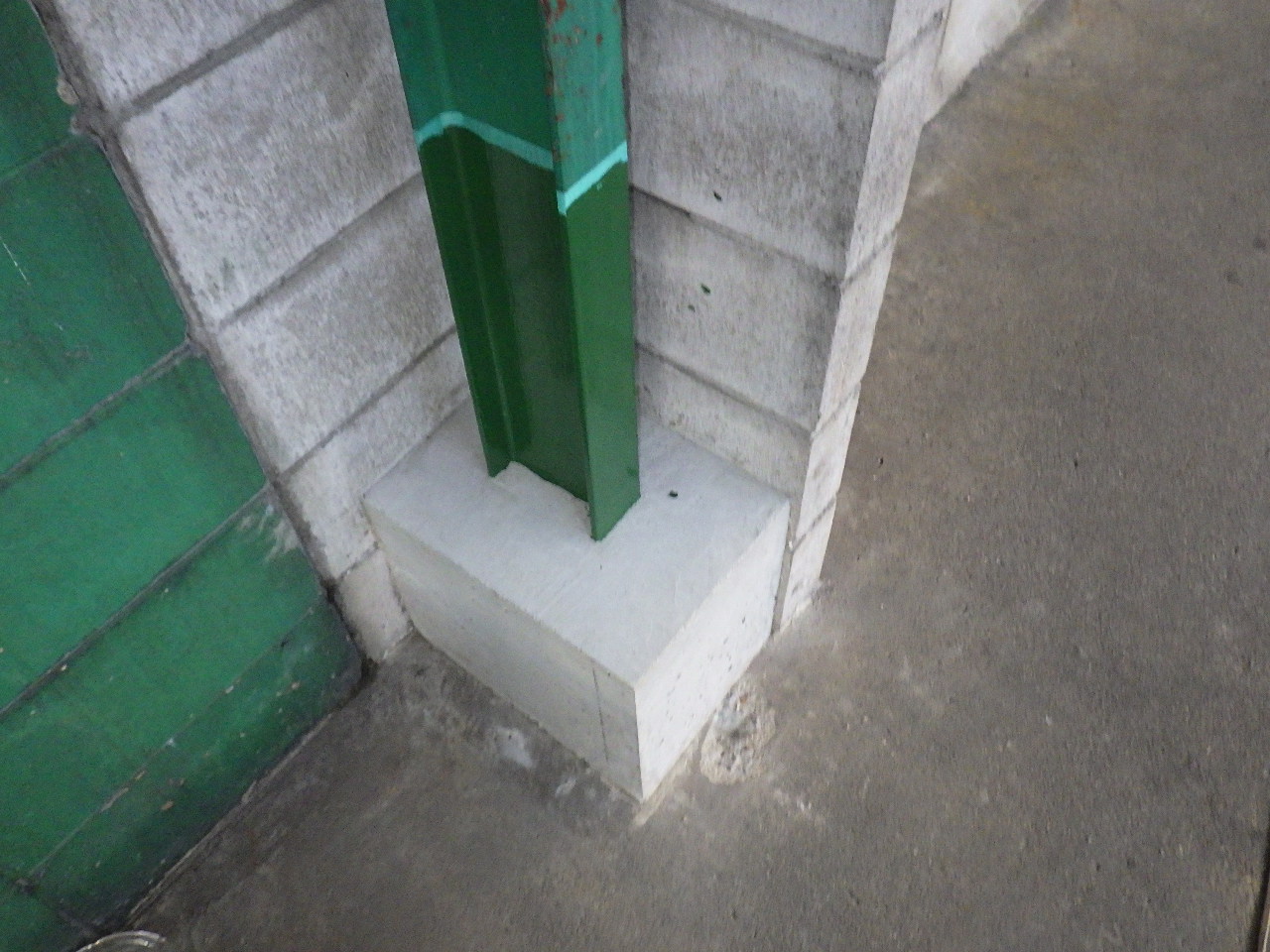 施工状況→ ↑腐食している部分の柱を切断のうえ撤去致します。 その際に鉄骨レベルが下がらないよう左右にパイプサポートで鉄骨を支えて下がらないように致します。 ↑切断面凸凹部分のベースPL側をグラインダー掛けをおこなうことで溶接面をしっかり確保します。 ↑切断したことで多少の柱位置がズレるので、専用治具を使い適正な位置へ戻します。 ↑補強する鋼材が適正なものが現場で再度検収します。 (※上記材料検収の工程が品質管理をするうえで非常に大事です。) ↑新設鋼材の溶接状況です。 ↑新設鋼材の溶接が完了です。 ↑溶接部分のサビ止め塗装をおこないます。 ↑水による腐食を繰り返さない為にコンクリートで根巻きをおこないます。 |