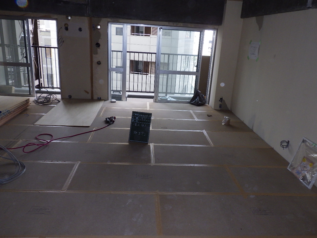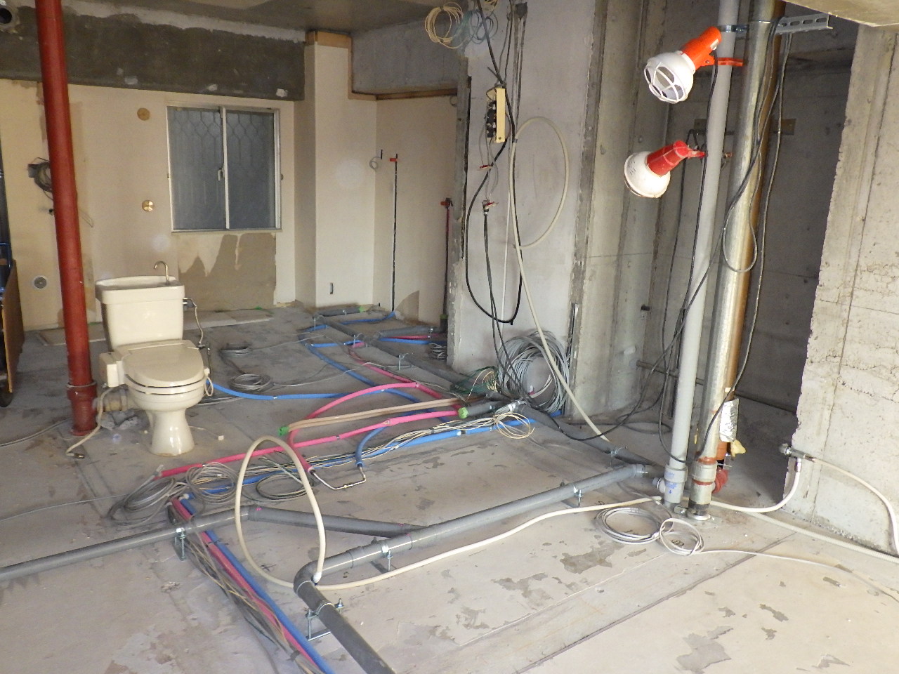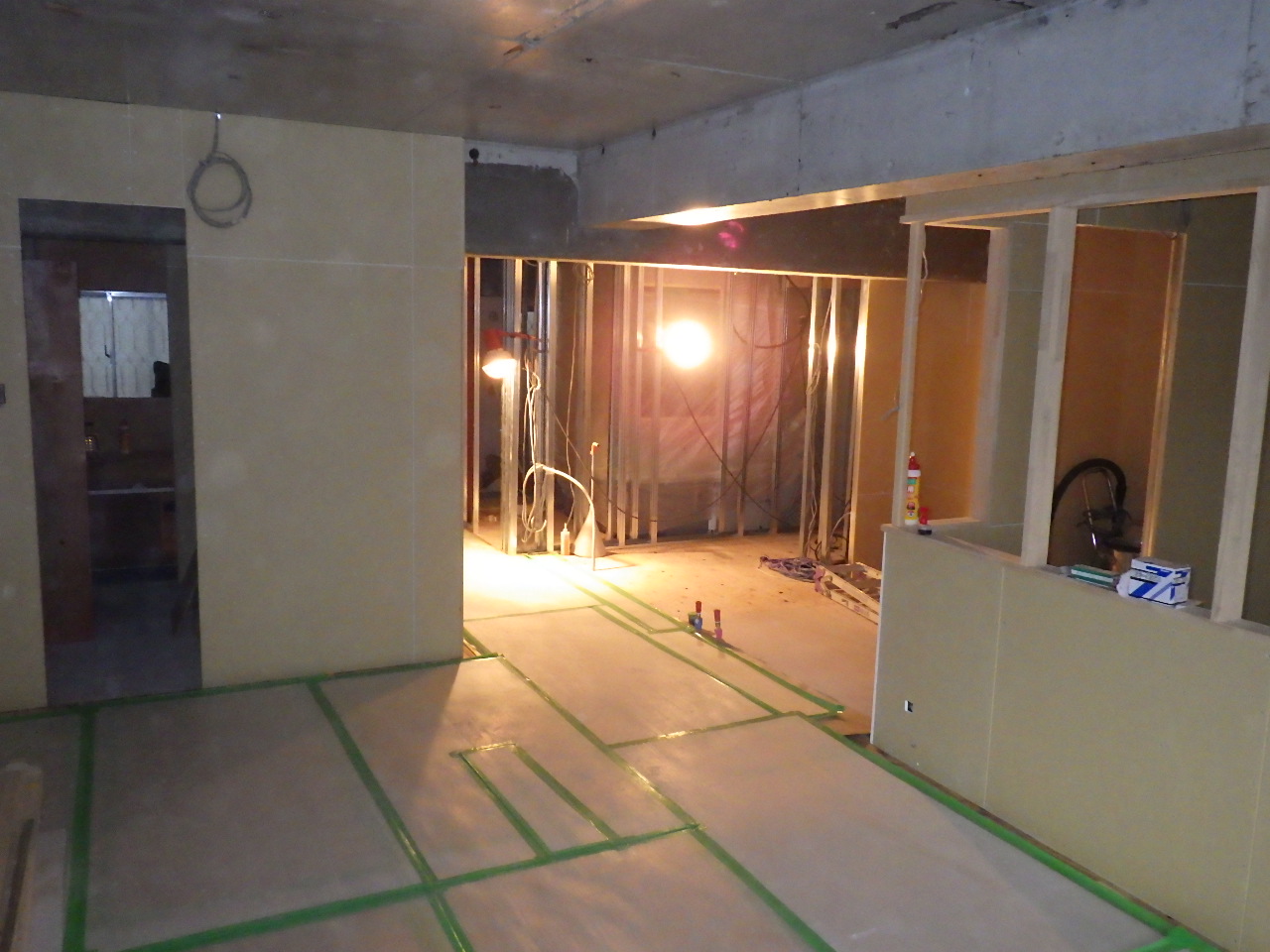 ↑内装解体工事。 ↑内装解体完了(フルスケルトン) ↑床下の給排水設備工事及び電気工事の先行工事。 ↑二重床工事。フロア全体を嵩上げしています。 (※テープは床下にゴミが入らないために施工しているものです) ↑間仕切壁工事。 (※今回は軽鉄下地を採用しています)