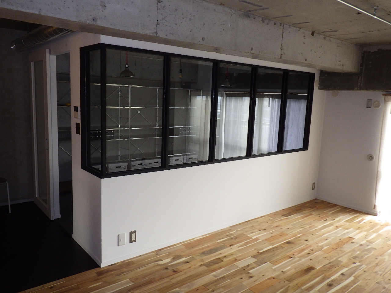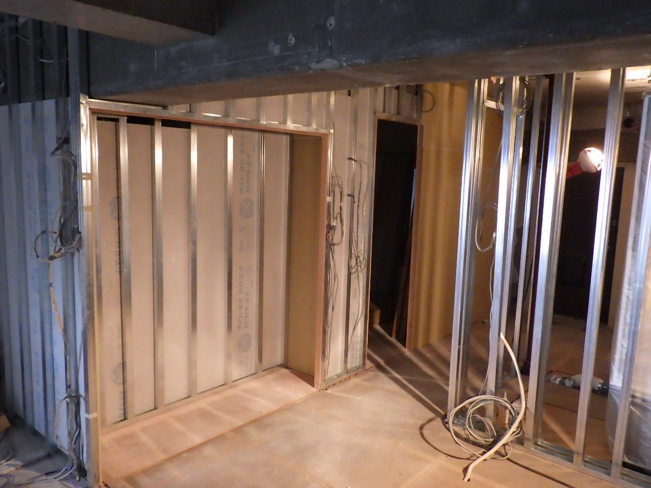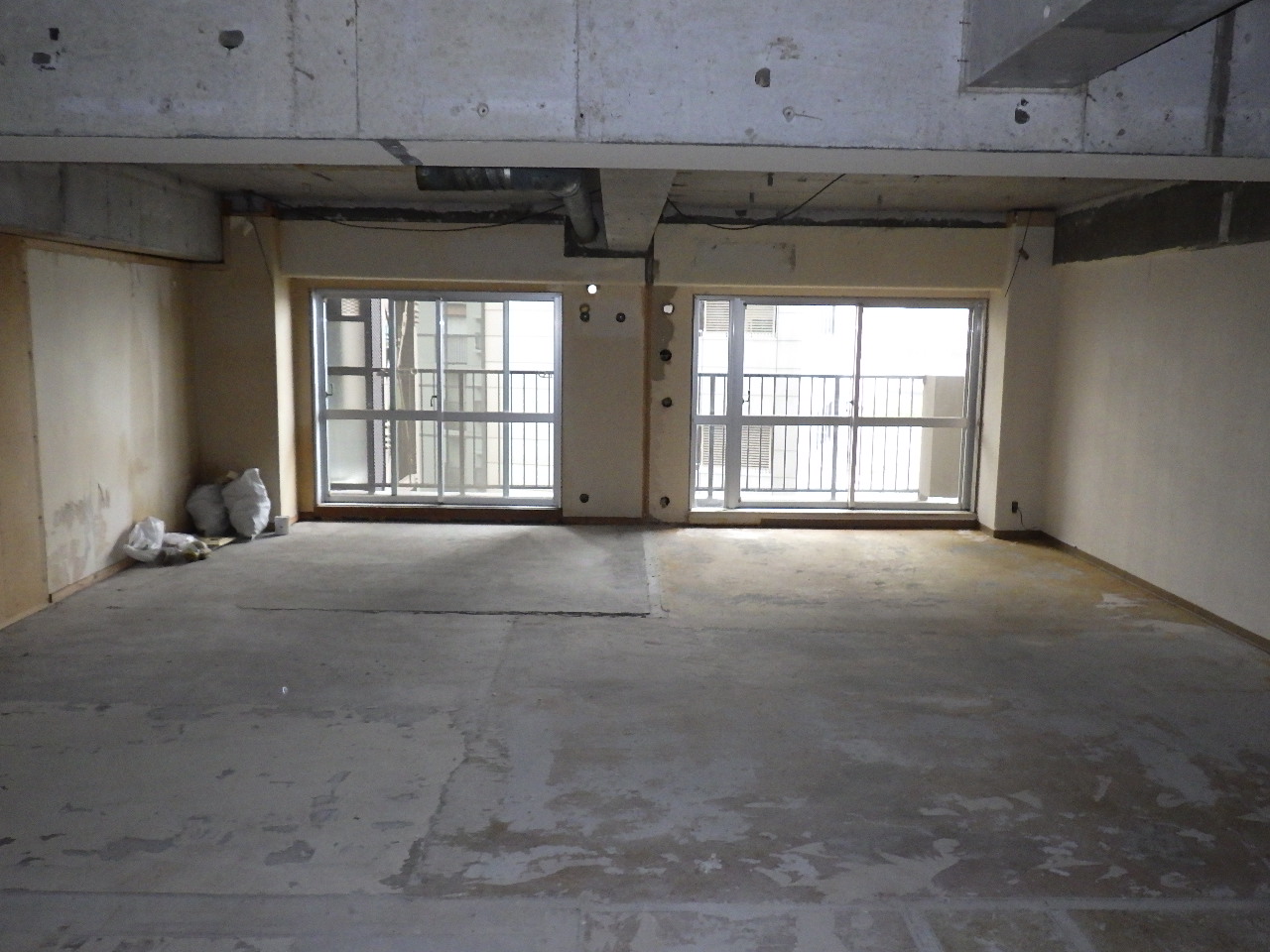 ↑内装解体工事。 ↑内装解体完了(フルスケルトン) ↑床下の給排水設備工事及び電気工事の先行工事。 ↑二重床工事。フロア全体を嵩上げしています。 (※テープは床下にゴミが入らないために施工しているものです) ↑間仕切壁工事。 (※今回は軽鉄下地を採用しています)