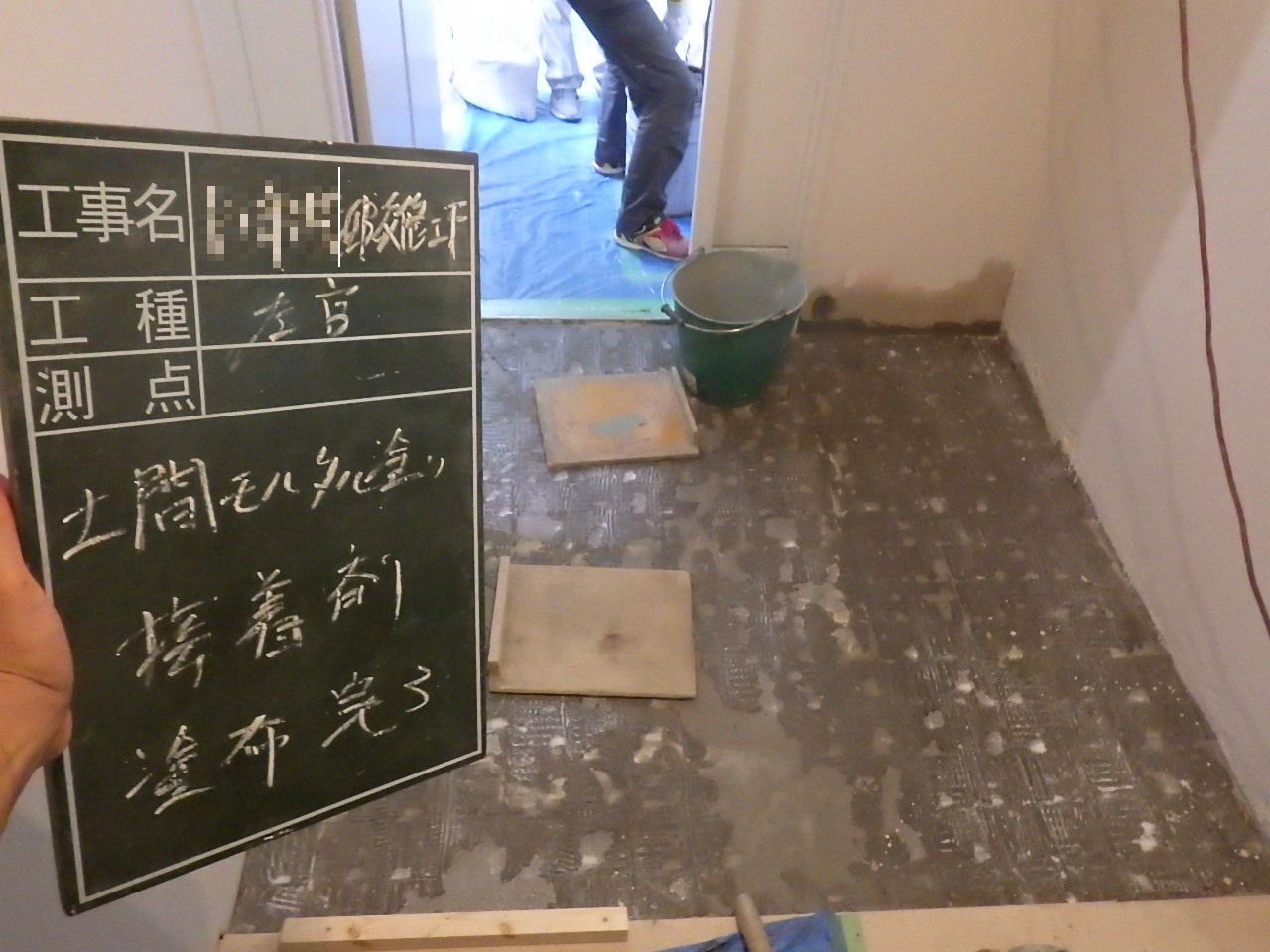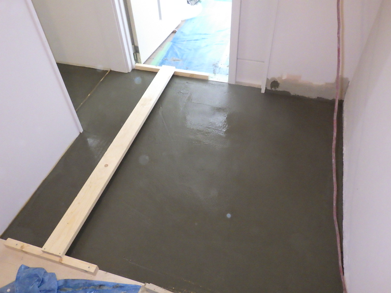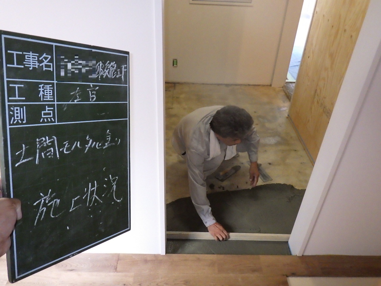 ↑左官工事。玄関土間モルタルを塗っている状況です。 ※数時間後に水がひいてきたところで、2回ほど 金ゴテで表面を押えます。